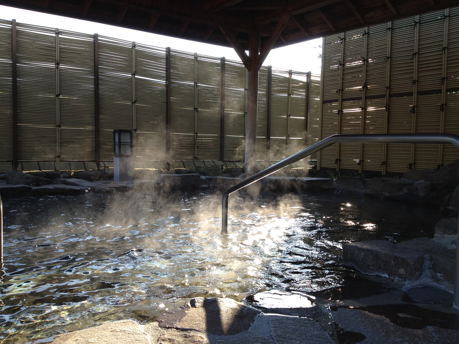 早朝の臥竜の湯の露天風呂です。露天風呂の湯気がよ〜く見えます。朝はだいぶ涼しいというよりは、少し寒く感じる日もでてきました。当館の施設管理スタッフは、早朝5時よりオープンに向けて、風呂の清掃、ボイラーの立ち上げなどを行います。