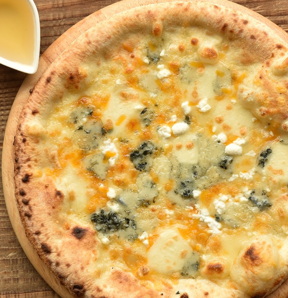 レッドチェダー、ゴルゴンゾーラ、パルミジャーノ、リコッタの4種類のチーズを使用した特製ピッツァ。お好みで須坂市鈴木養蜂場のハチミツをかけてどうぞ。