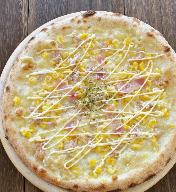 たっぷりのコーンとツナをトッピングし焼き上げ、仕上げにマヨネーズをかけました。