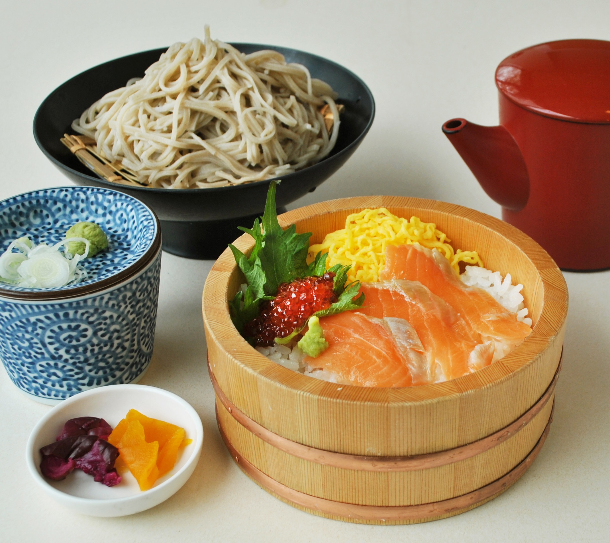 脂ののった信州サーモンの丼と手打ち蕎麦が楽しめるセットです。