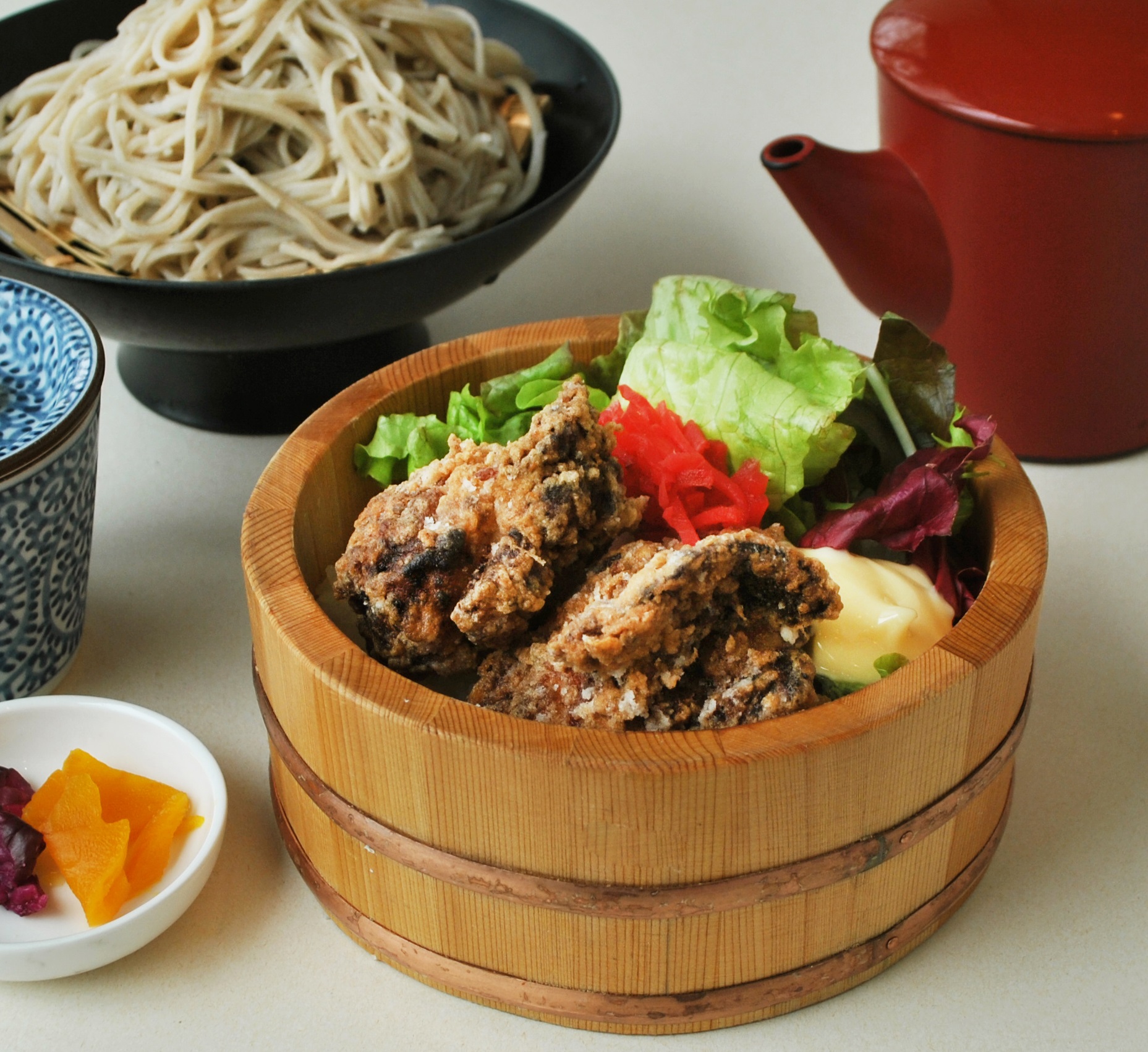須坂産醤油で味付けしたジューシーな唐揚げと手打ち蕎麦が楽しめるセットです。