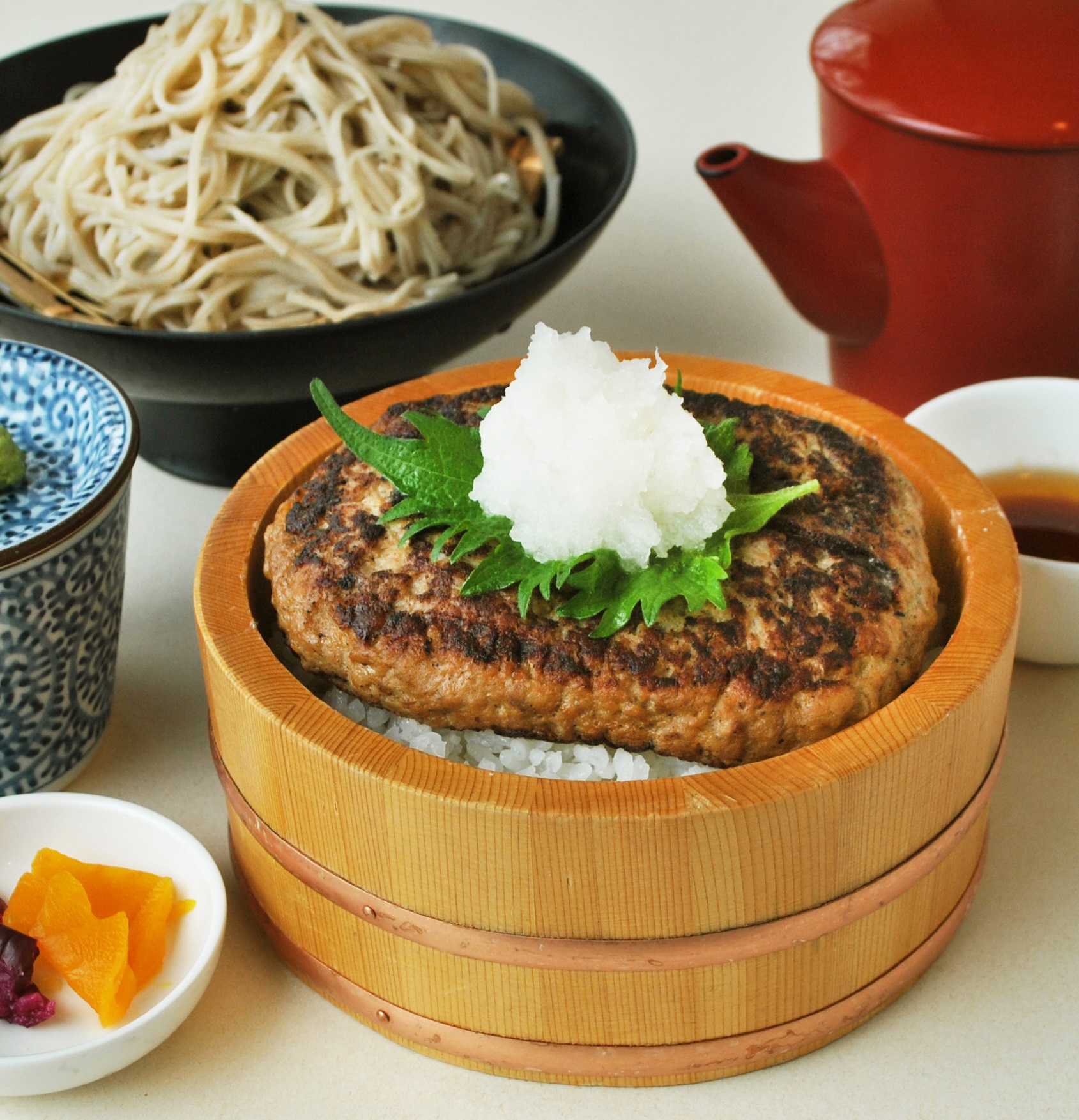 大きなハンバーグをのせたボリューム満点の桶小丼と手打ち蕎麦のセットです。