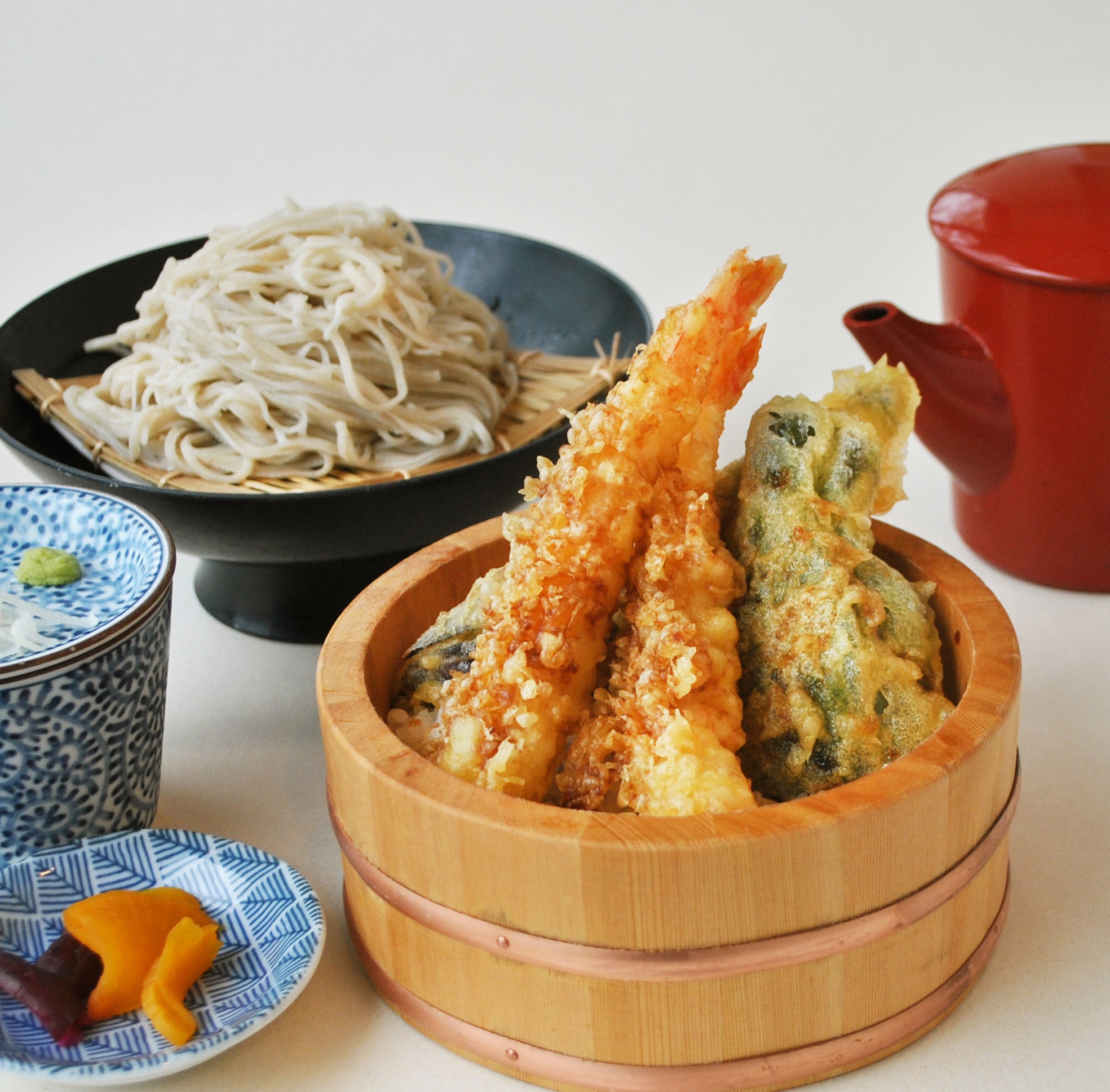 海老天の桶小丼と手打ち蕎麦が楽しめるセットです。