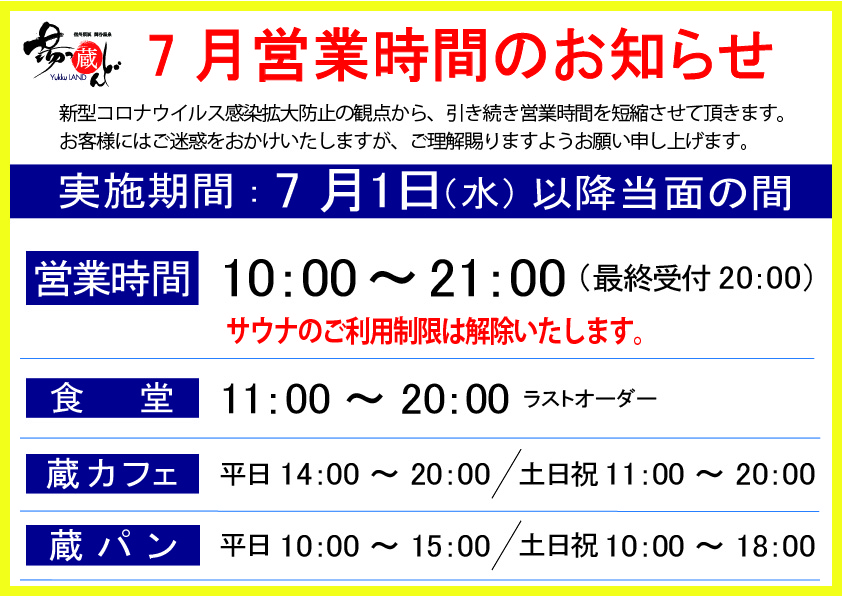 7月営業時間のご案内を致します。