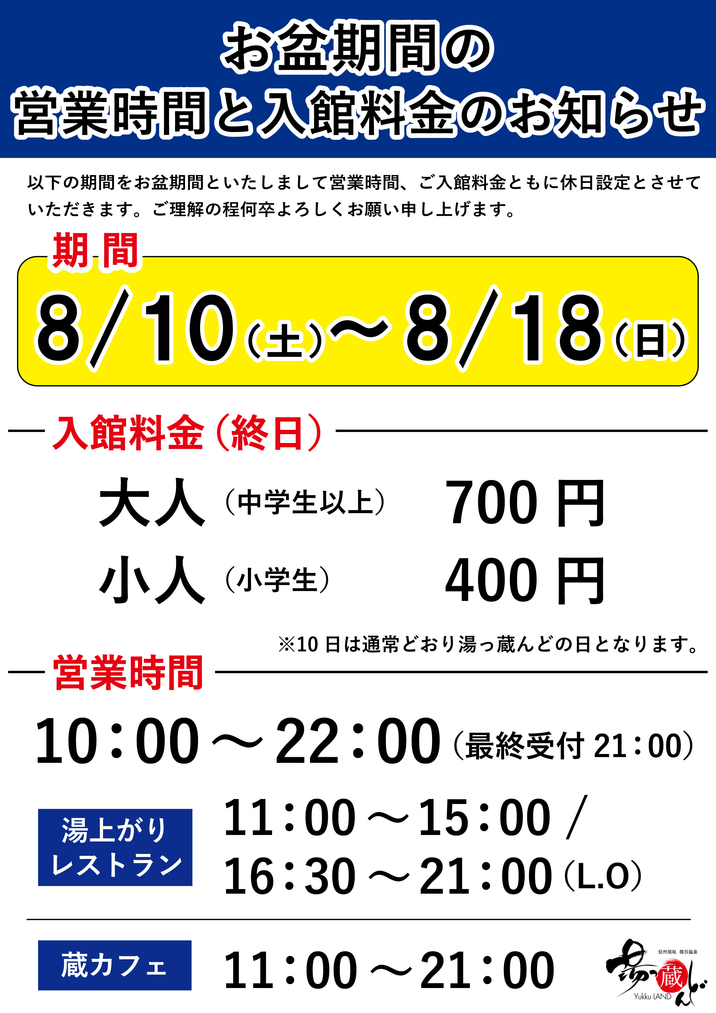 ※10日は通常どおり「湯っ蔵んどの日」となります。