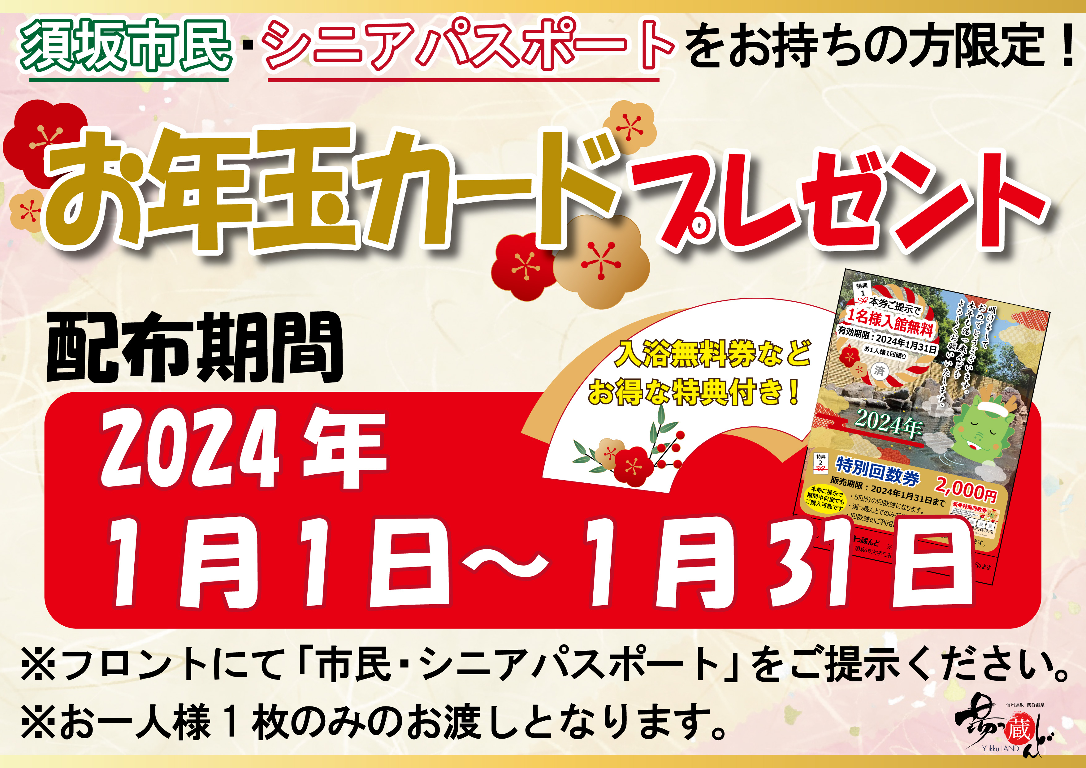 2024年1月1日~1月31日までの期間、フロントにて市民パスポート・市民シニアパスポートをご提示いただきますと入浴無料などの特典付きお年玉カードをプレゼントいたします。