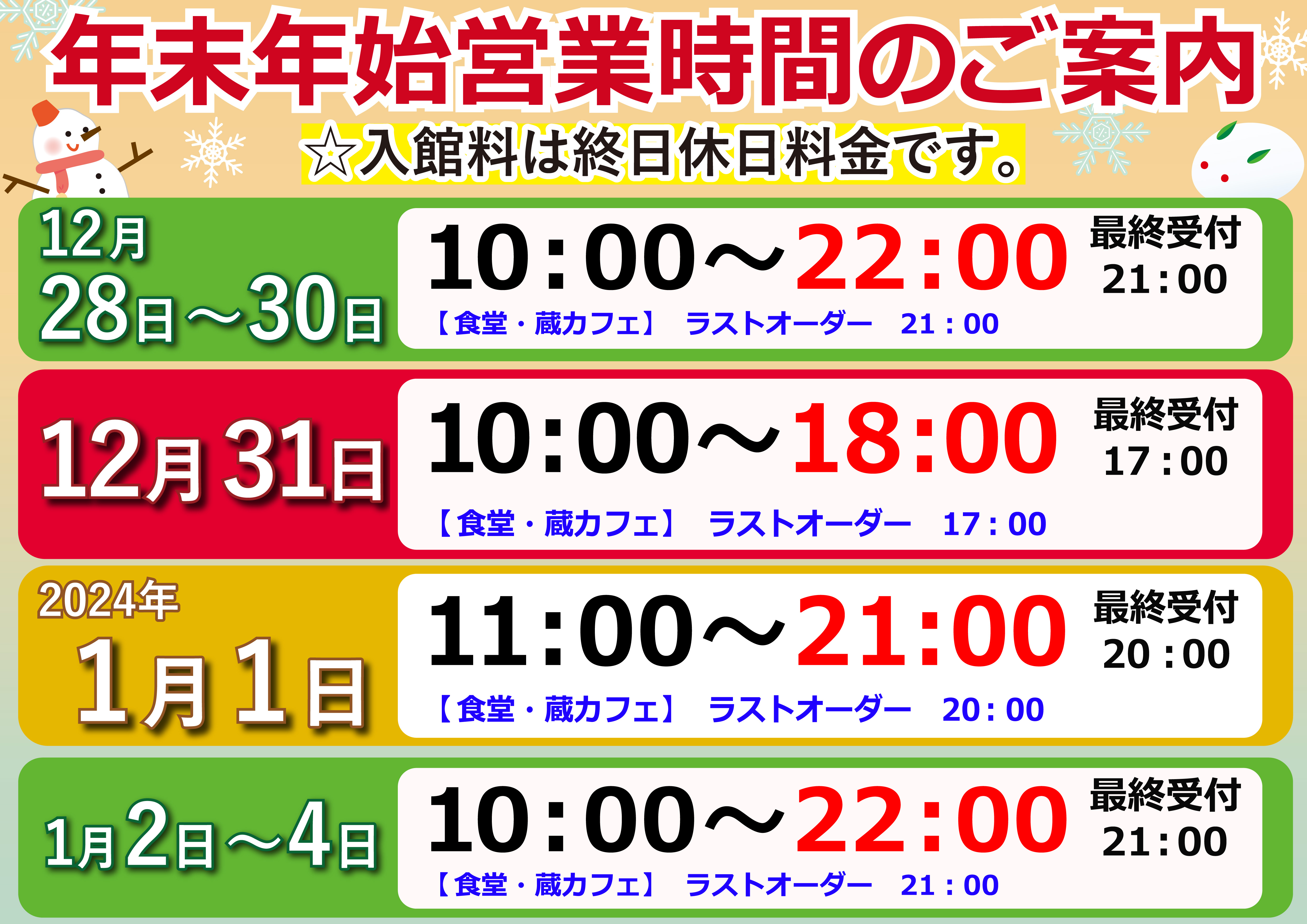 2024年 1月 1日(月) 11:00~21:00(最終入館受付20:00)