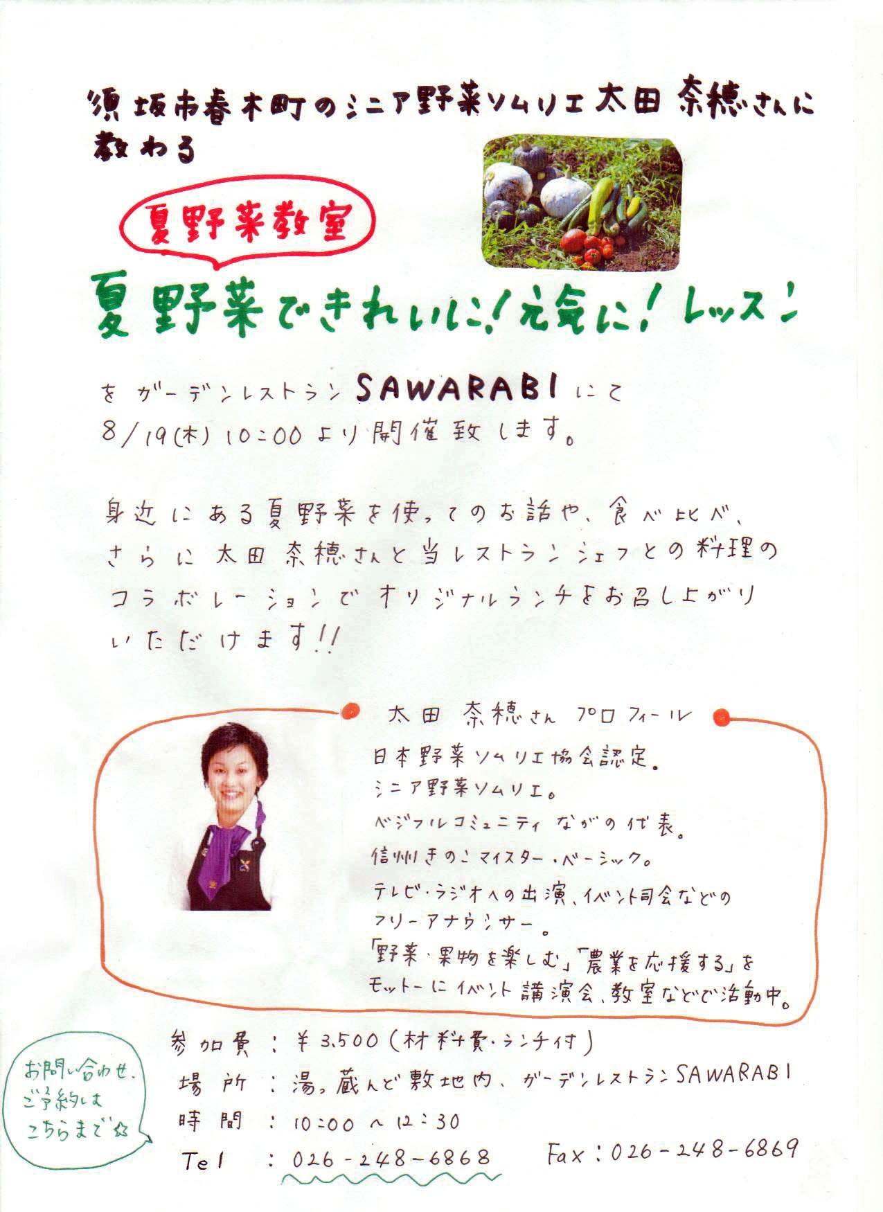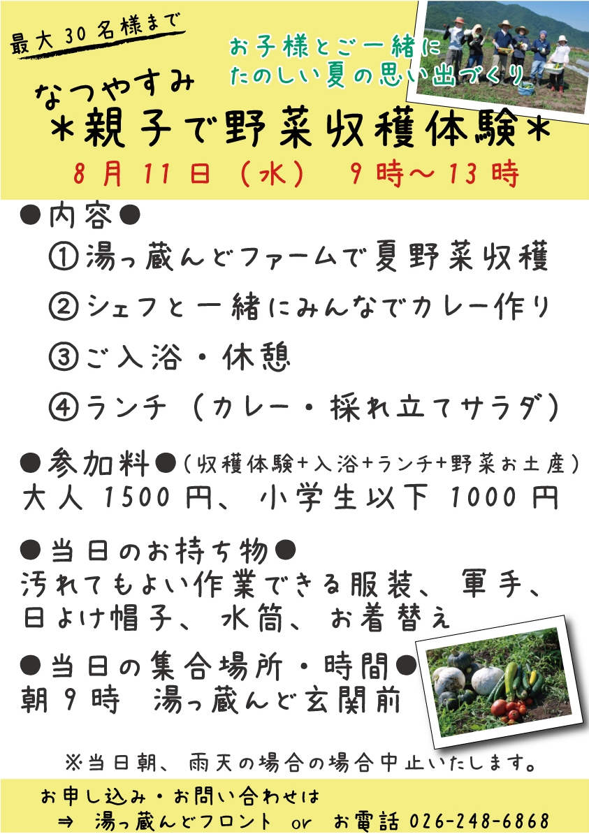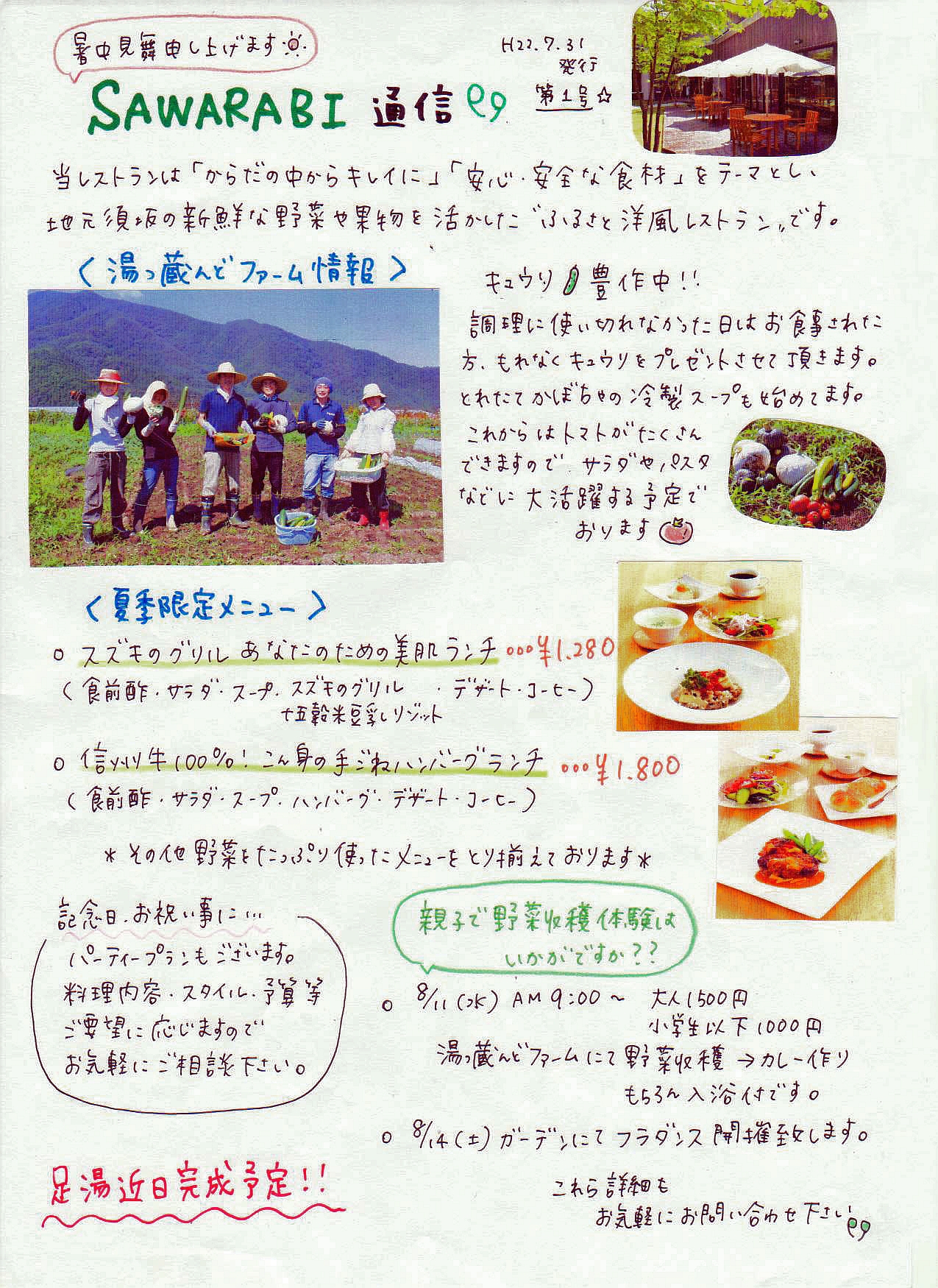 ガーデンレストランSAWARABIの記念すべき第1号の通信が発行されました。湯っ蔵んど館内にて配布しておりますので 是非ご覧下さい♪体験教室、講座も開催しますよ♪夏休みの思い出づくり、新しい趣味づくりにいかがでしょうか。●近日開催のカルチャー倶楽部●8/11(水) 親子で野菜体験教室8/19(木) 夏野菜できれいに!元気に!レッスン詳しくは通信をご覧下さい↓