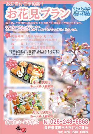 湯っ蔵んどの多目的広場という野外の広場にプリンセス雅桜、しだれ桜、普賢桜など様々な桜が周囲をぐるりと囲んだスペースがあります。数年前に植えた桜が成長し近年、見事な花をつけるようになりました。今年からこの会場でお弁当と指定席でゆっくりすごせる『お花見プラン』をご用意させて頂きました。料金は食事代・場所代込みで大人1500円小人800円となっております。お飲み物の持ち込みは自由ですぜひ湯っ蔵んどの見事な桜もお楽しみくださいませ。
