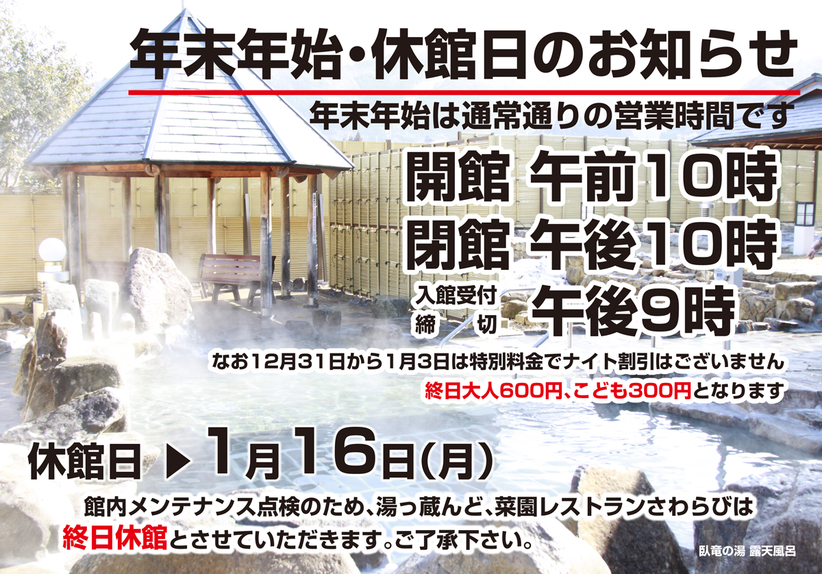 年末年始の営業のお知らせです。 当館は年末年始は通常通りの時間で営業しております。 ■開館 午前10時 ■閉館 午後10時(入館受付締切 午後9時) なお、12月31日〜1月3日は特別料金のため、ナイト割引はありません。 終日大人600円、子供300円となります。 また、1月16日は館内メンテナンス点検のため、 終日休館とさせていただきます。 ご了承下さい。