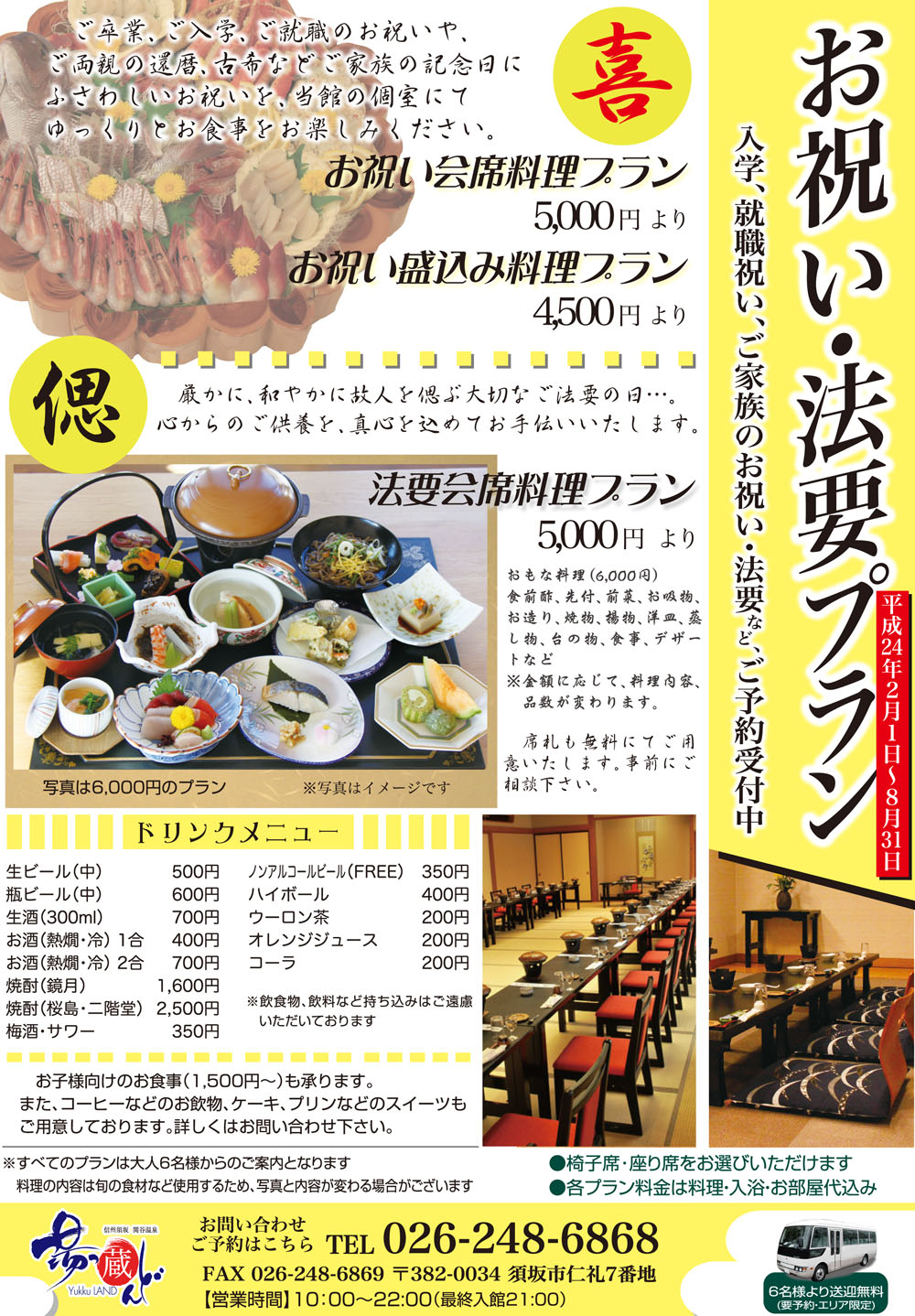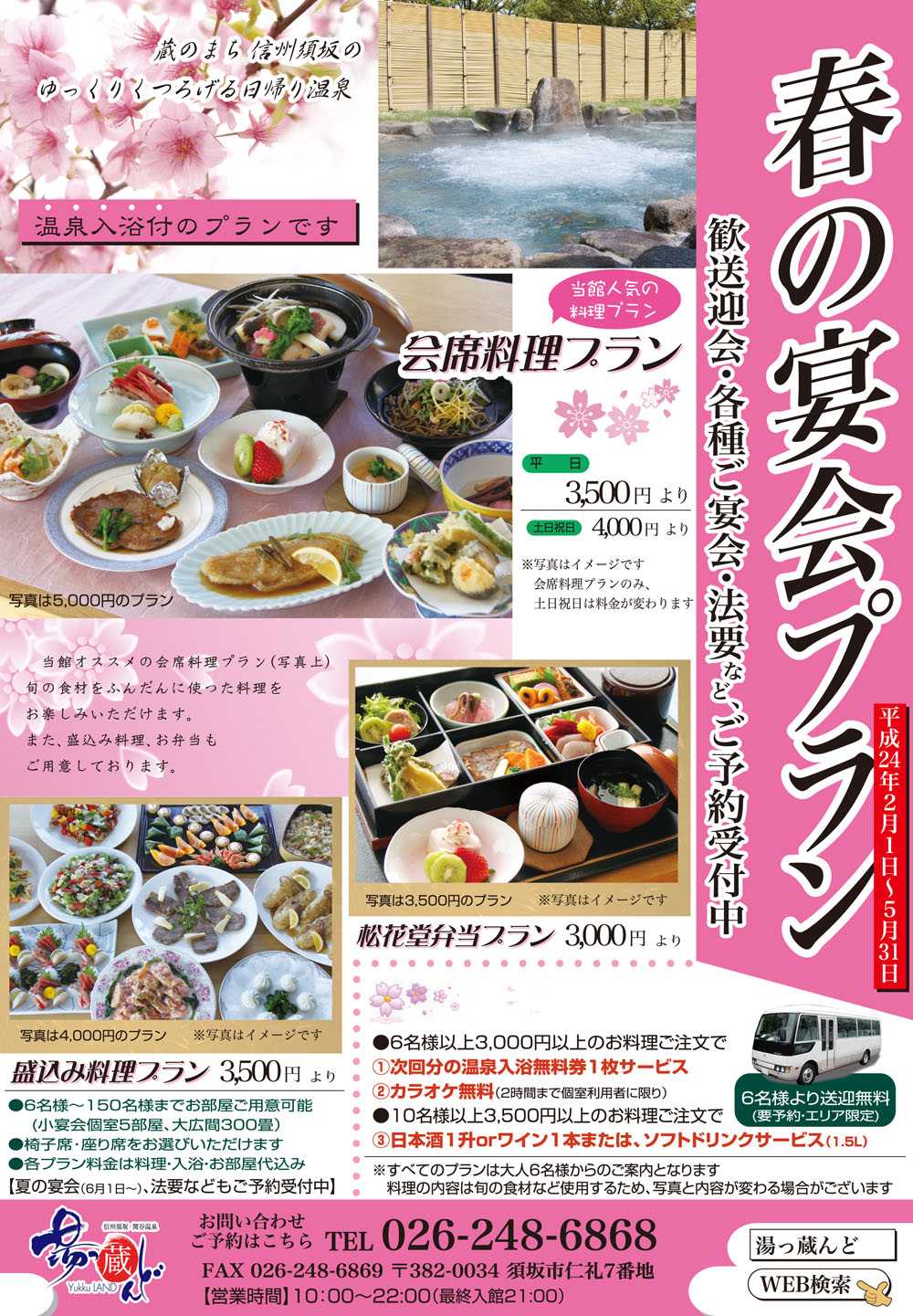 歓送迎会、各種ご宴会などの春の宴会プランご予約受付中です。 ■会席料理 3,500円〜(平日) 4,000円〜(土日祝日) ■盛込み料理 3,000円〜(終日) ■松花堂弁当 3,000円〜(終日) ※大人6名様からのご案内となっています。 すべて入浴料込みのお得なプラン♪ ぜひご利用下さい。 お祝い事、ご法要などの会席料理プランも2月以降のご予約も承っております。