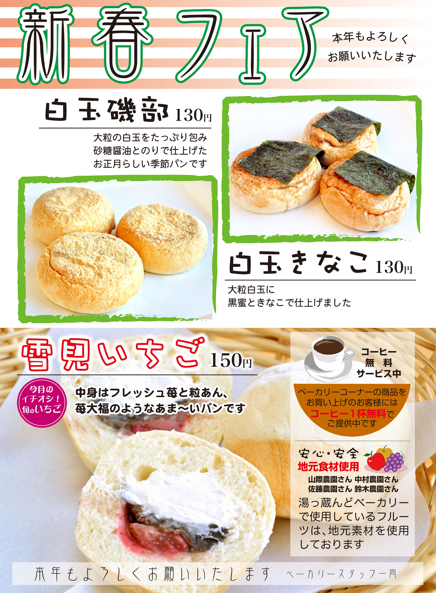 ベーカリーコーナーでは、お正月らしいパンや、旬の苺を使ったパンが期間限定で登場。