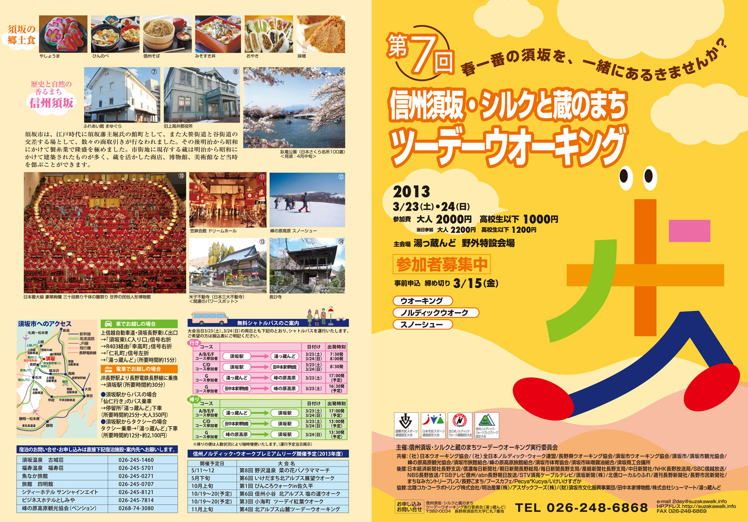 須坂の町並み、山里を歩いて楽しむ『第7回信州須坂シルクと蔵のまちツーデーウオーキング』が今年も3月に開催! 現在、参加者募集中です。 春の須坂、ひな祭りで賑わう市街地を散策しながらウオーキングが楽しめます♪ お問い合せは TEL026-248-6868へ