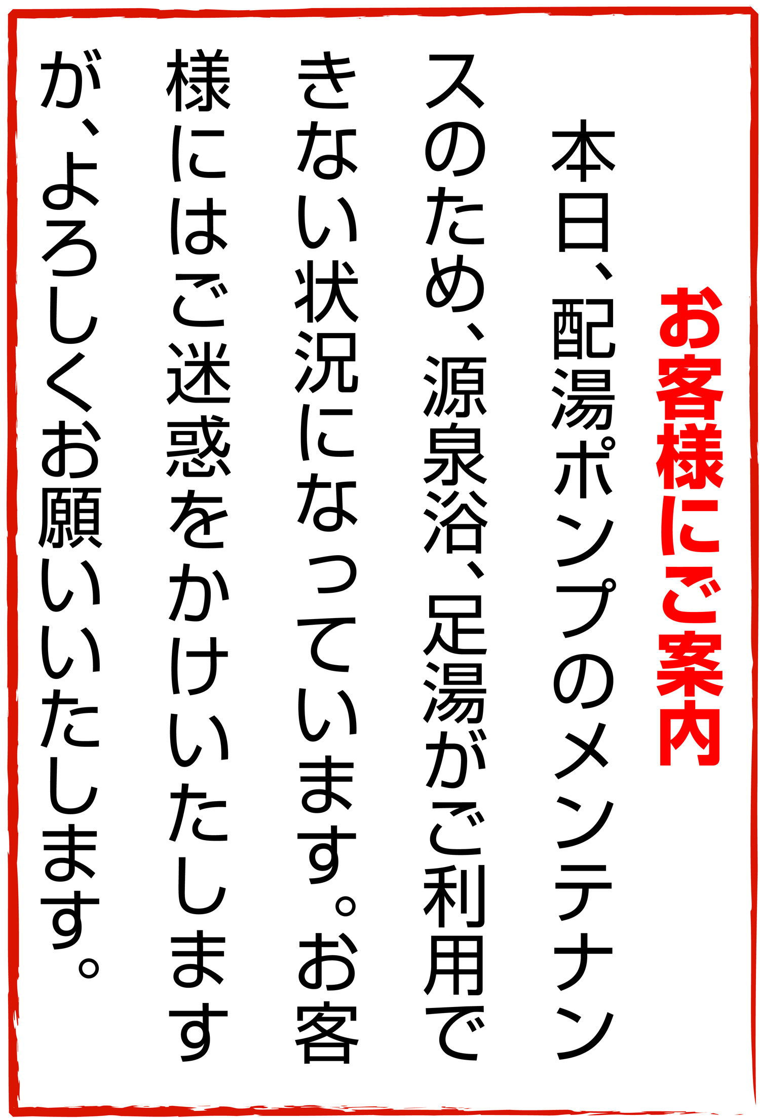 本日源泉浴・足湯はメンテナンスの為 使用できません。 お客様には大変ご迷惑をおかけ致しますが ご了承くださいませ。