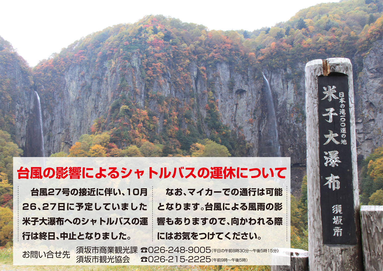 台風27号の接近に伴い、10月26日、27日に予定していました米子大瀑布へのシャトルバスの運行は終日、運休となりました。また、マイカー規制は解除となりますが、台風による風雨を伴いますので、向かう際はお気をつけてください。