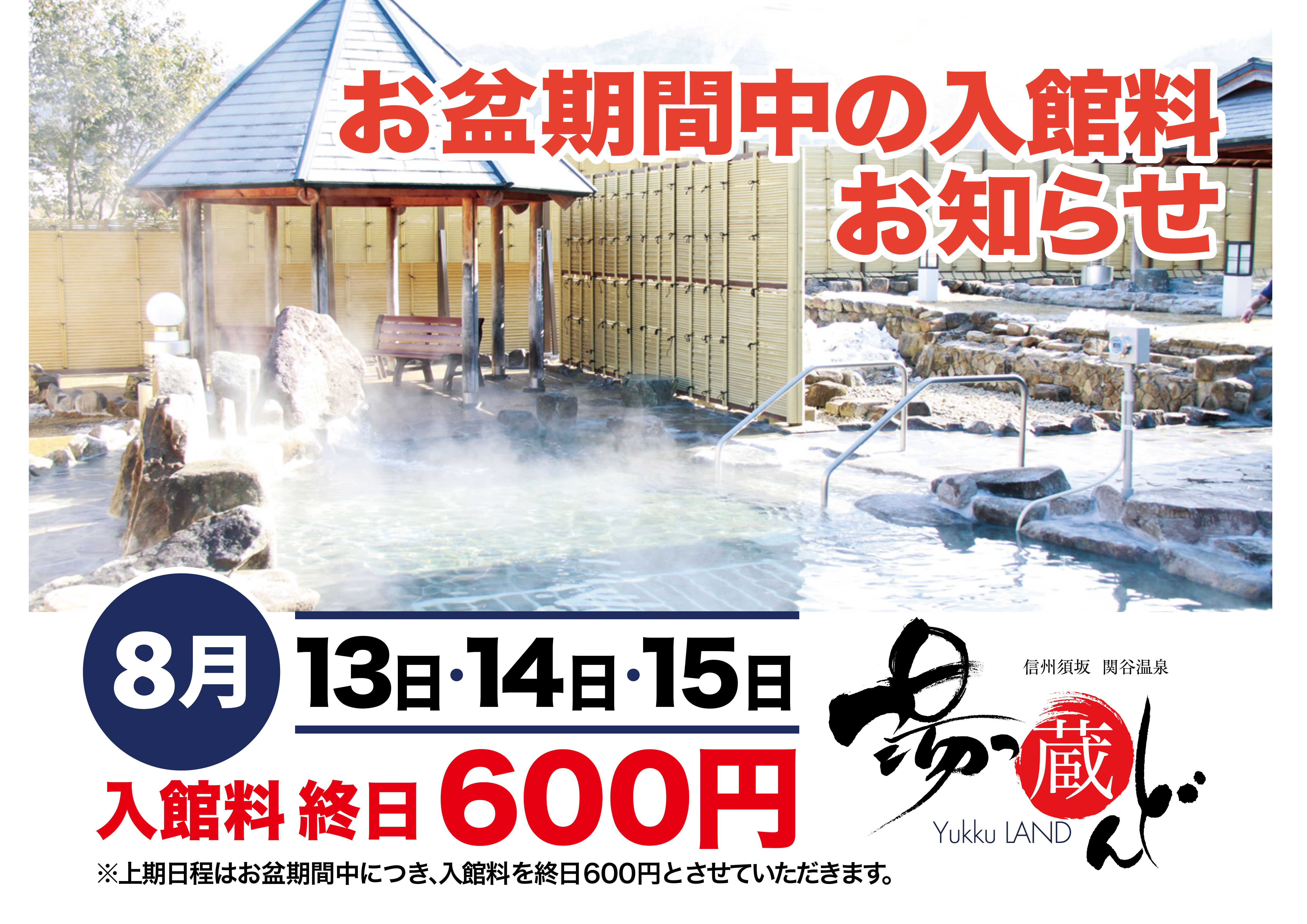 いつも湯っ蔵んどをご利用ありがとうございます。 お盆期間中の入館料についてお知らせ致します。