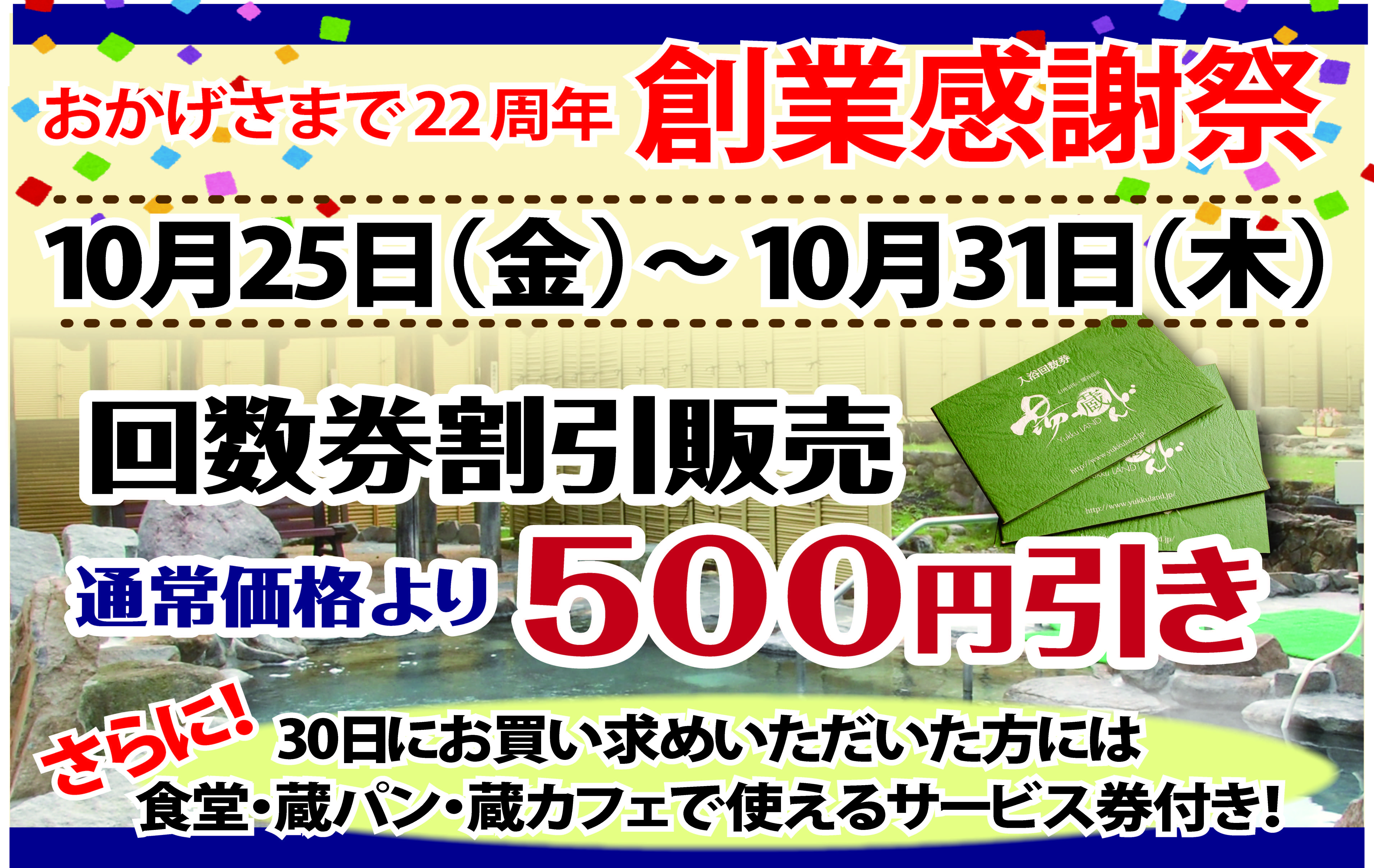 2019年10月25日(金)~10月31日(木)まで創業感謝祭といたしまして、10枚綴り回数券を通常価格から500円引きにて販売致します。