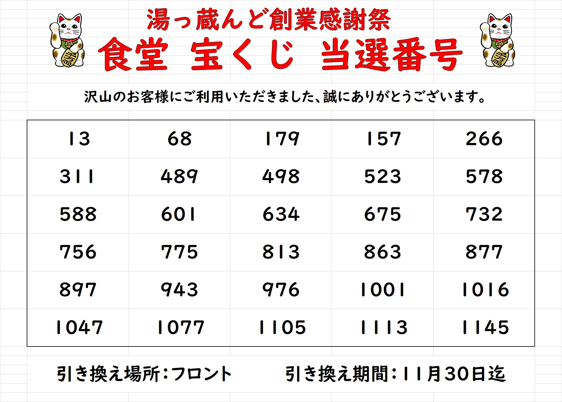 創業感謝祭企画「食堂宝くじ」の当選番号を発表させていただきます。