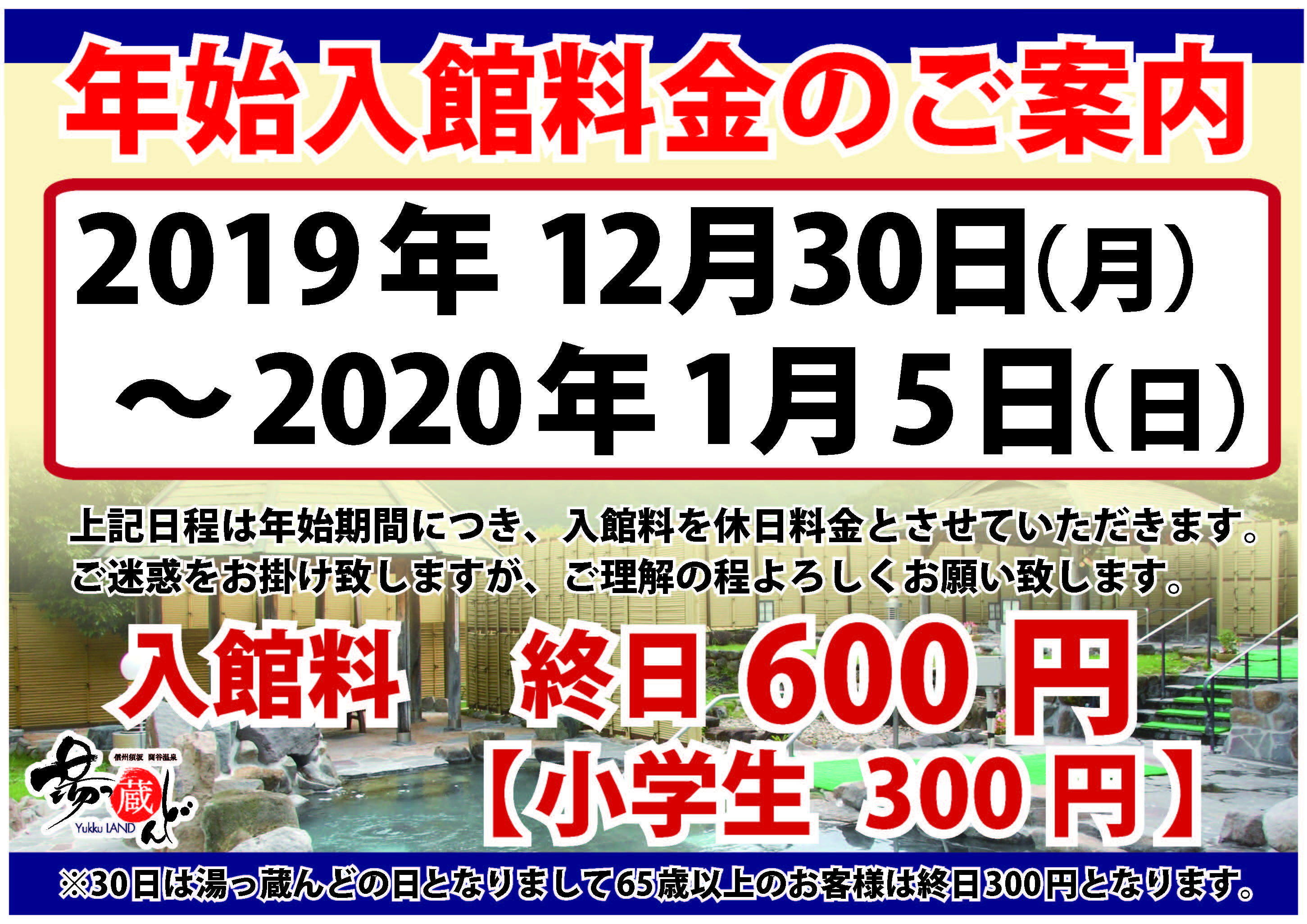 2019年12月30日(月)~2020年1月5日(日)は、年末年始期間につき終日休日料金とさせて頂きます。