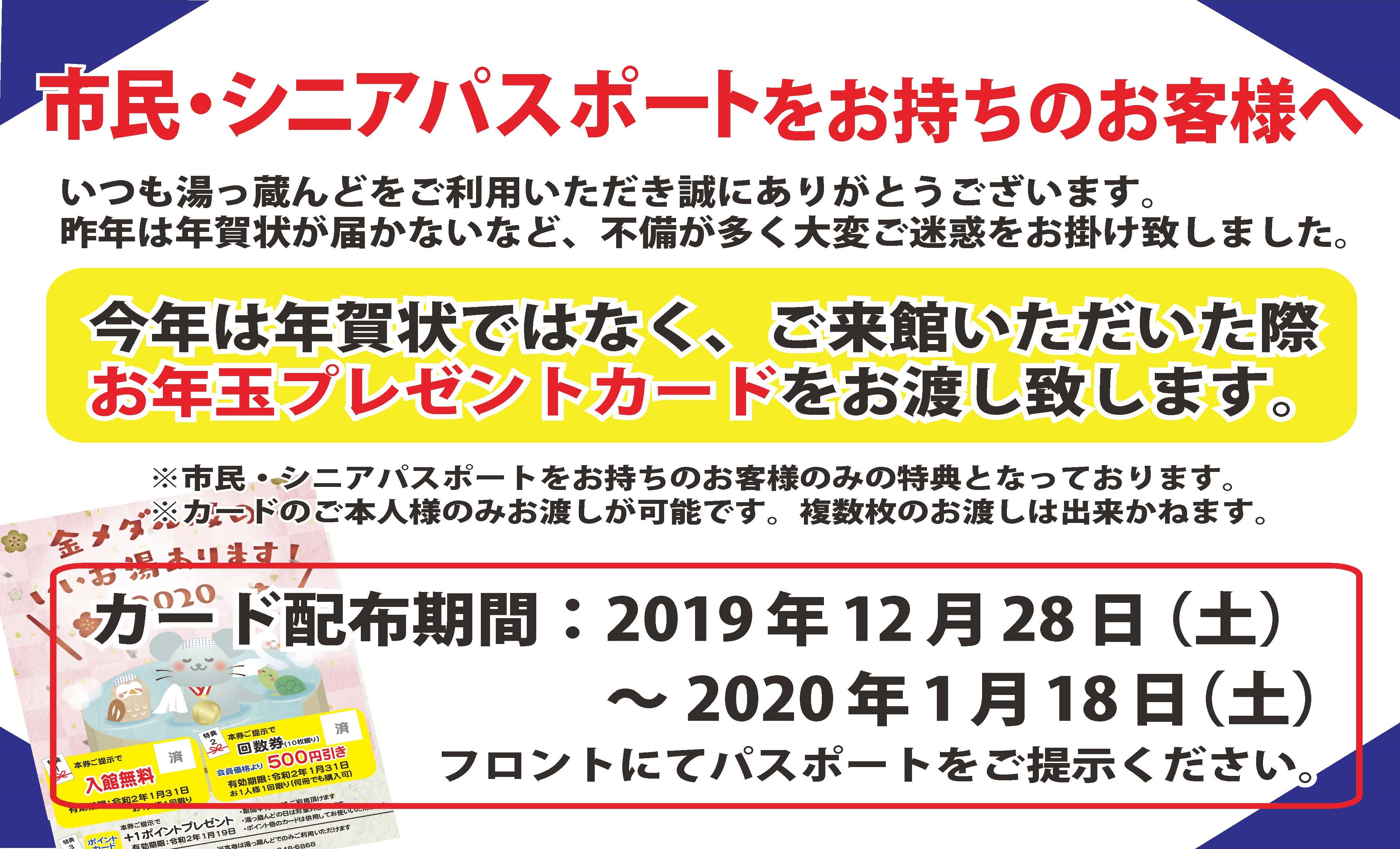1月18日まで須坂市民・シニアパスポートをお持ちのお客様に、入館サービスや回数券割引などの特典付きお年玉カードをプレゼントしております。