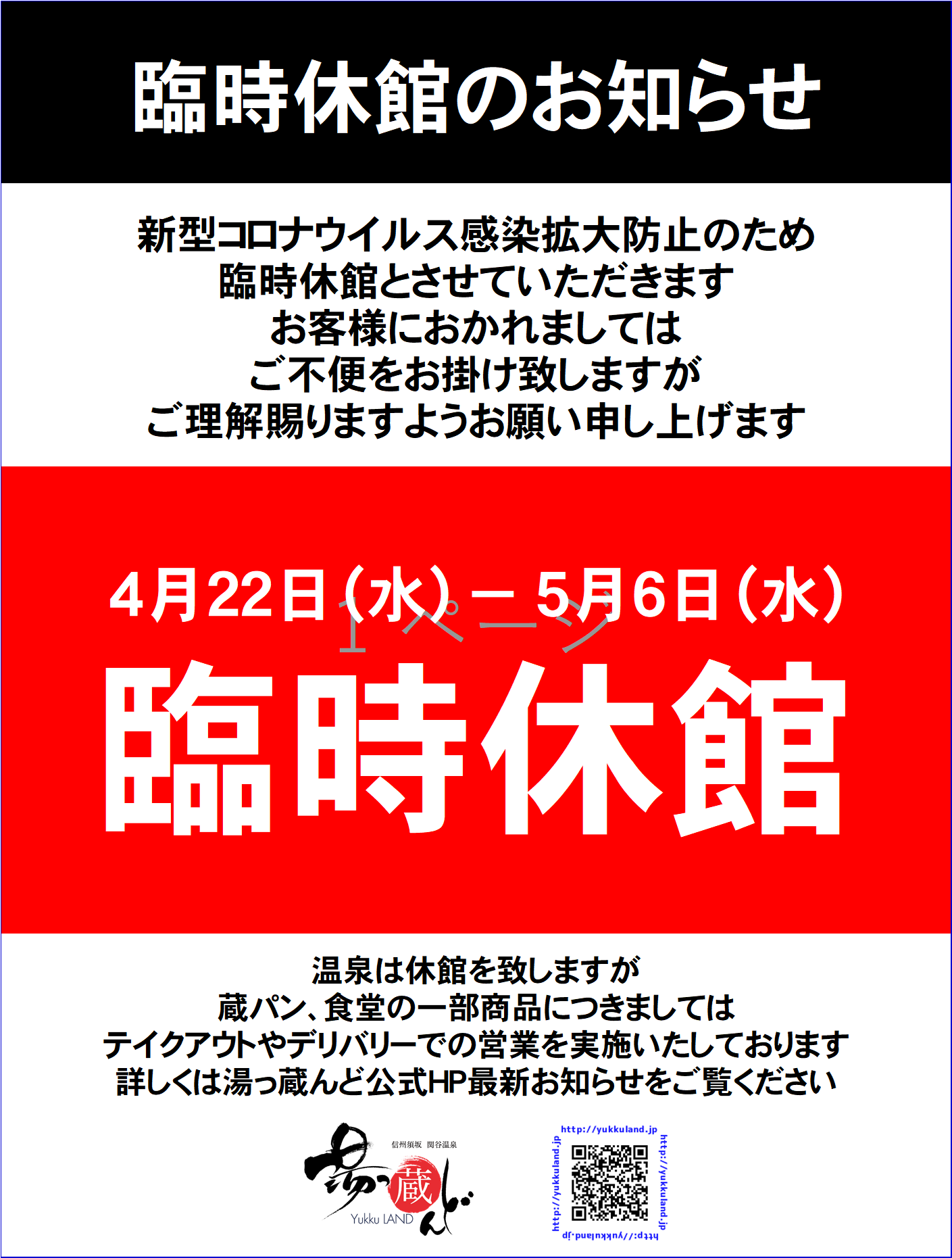 2020年4月22日(水)ー 2020年5月6日(水)を 臨時休館とさせていただきます。