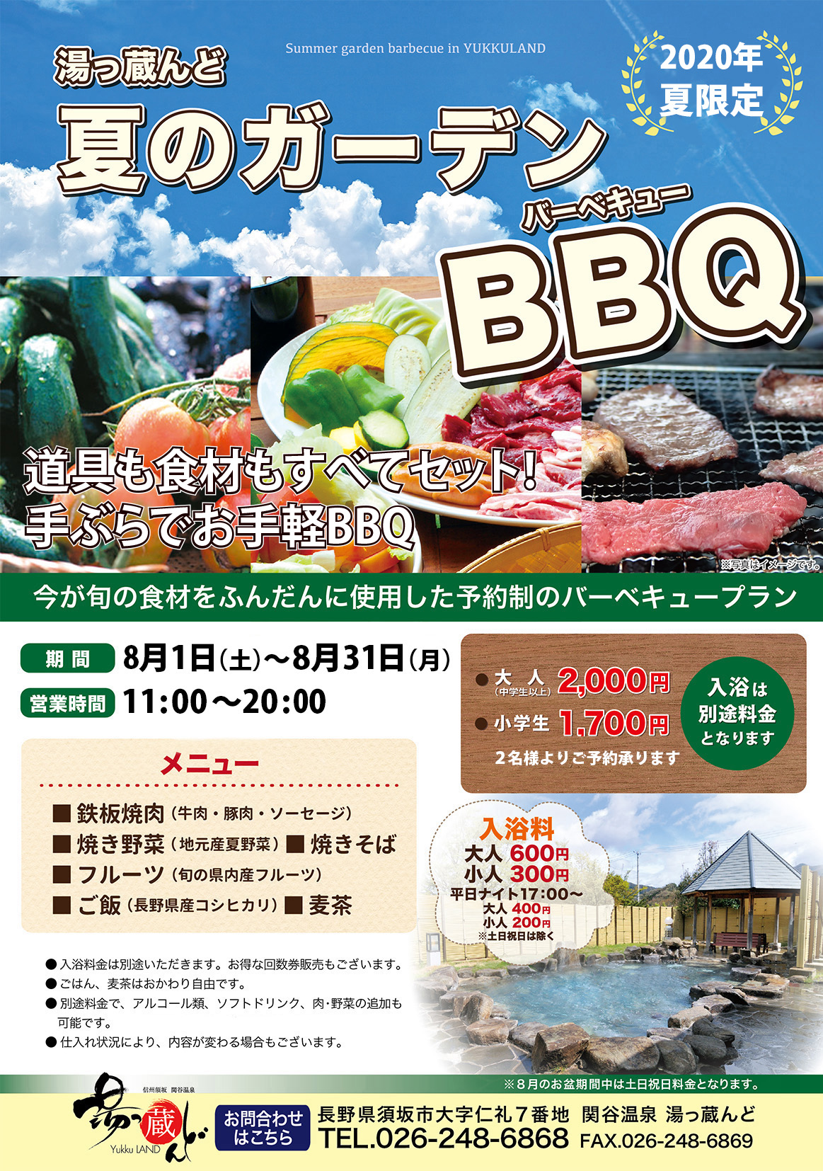ぜひこの夏の思い出に湯っ蔵んどのバーベキューをご利用ください。
