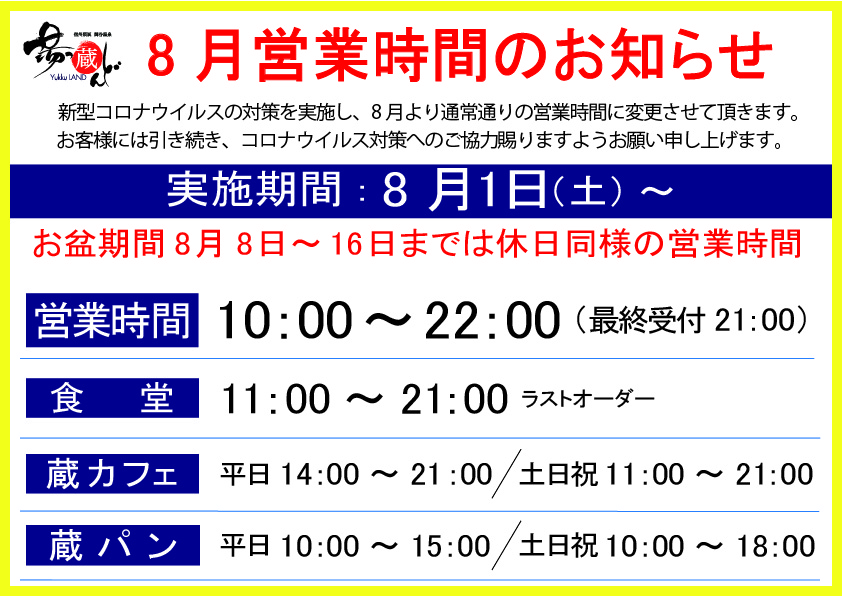 8月は通常通り、夜22時までの営業とさせていただきます。