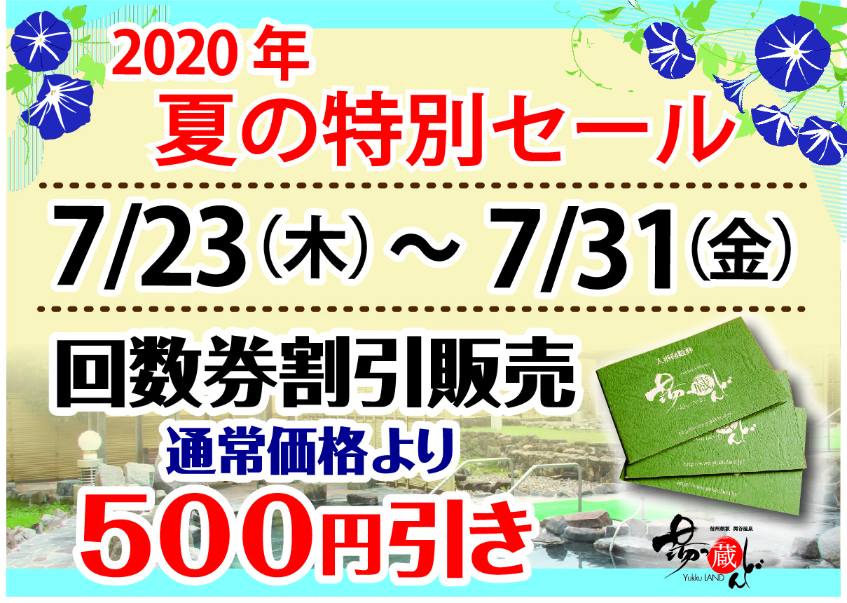 2020年7月23日(木)~7月31日(金)まで夏の特別セールといたしまして、10枚綴り回数券を通常価格から500円引きにて販売致します。