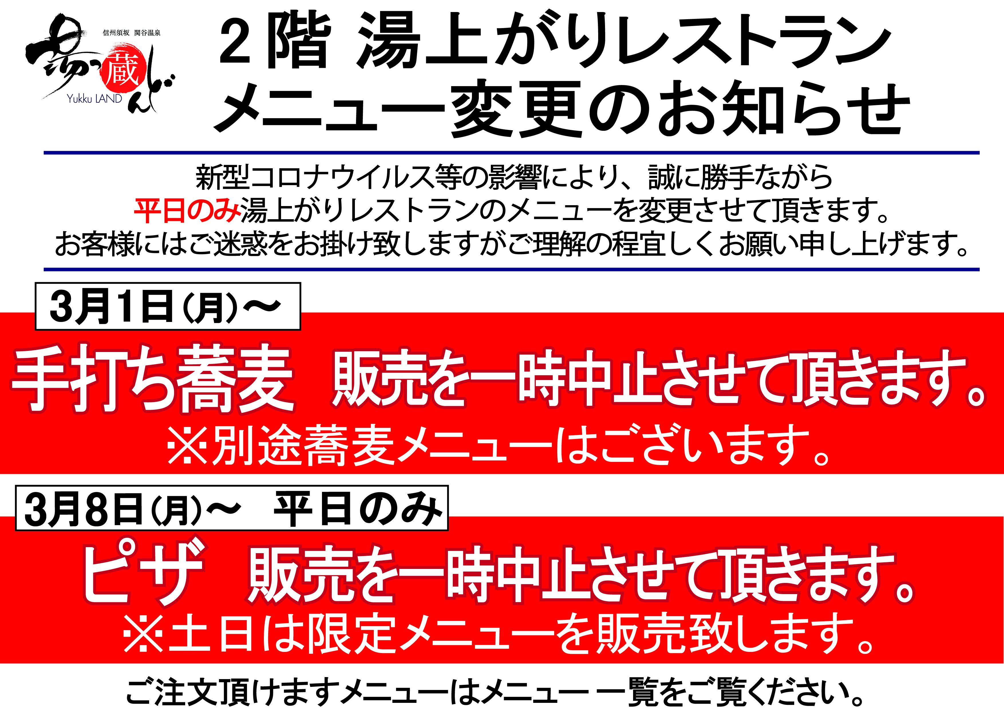 <湯上がりレストラン> ・手打ち蕎麦・・・3月1日(月)より一時販売中止とさせて頂きます。 ※別途蕎麦メニューはございます。 ・ピザ・・・3月8日(月)より平日のみ一時販売中止とさせて頂きます。 ※土日は限定メニューを販売いたします。湯っ蔵んど 施設長