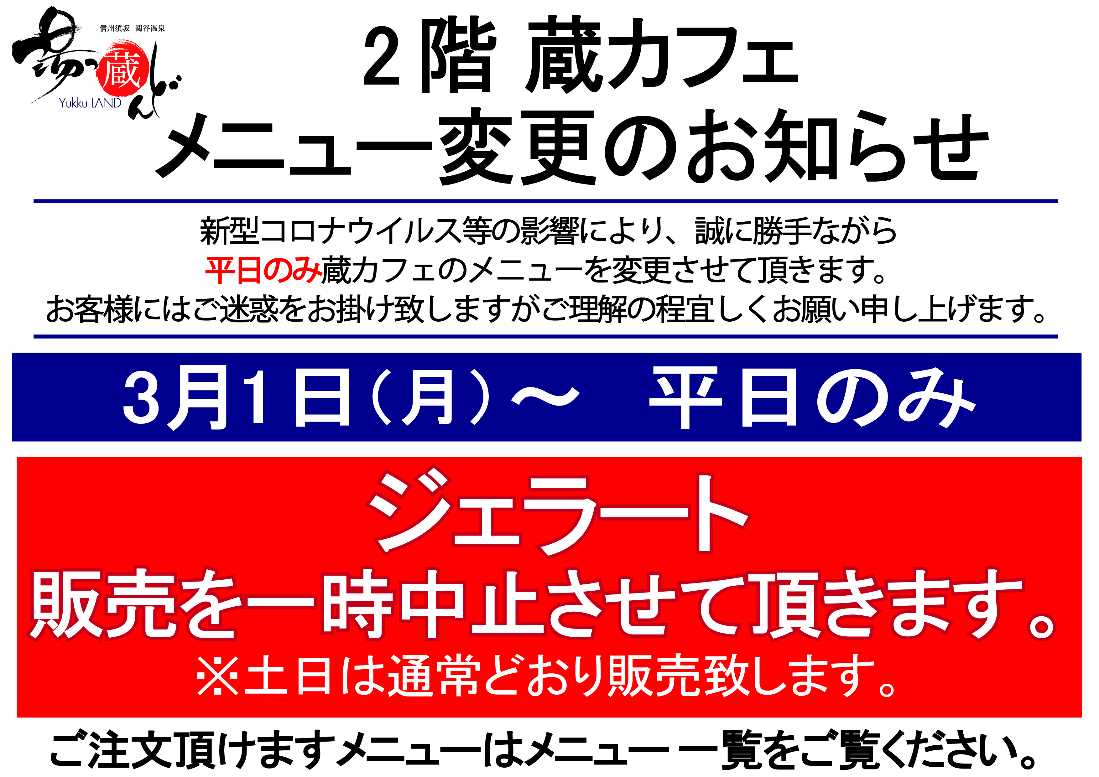 誠に勝手ながら、湯上がりレストランと蔵カフェのメニューを変更させて頂きます。