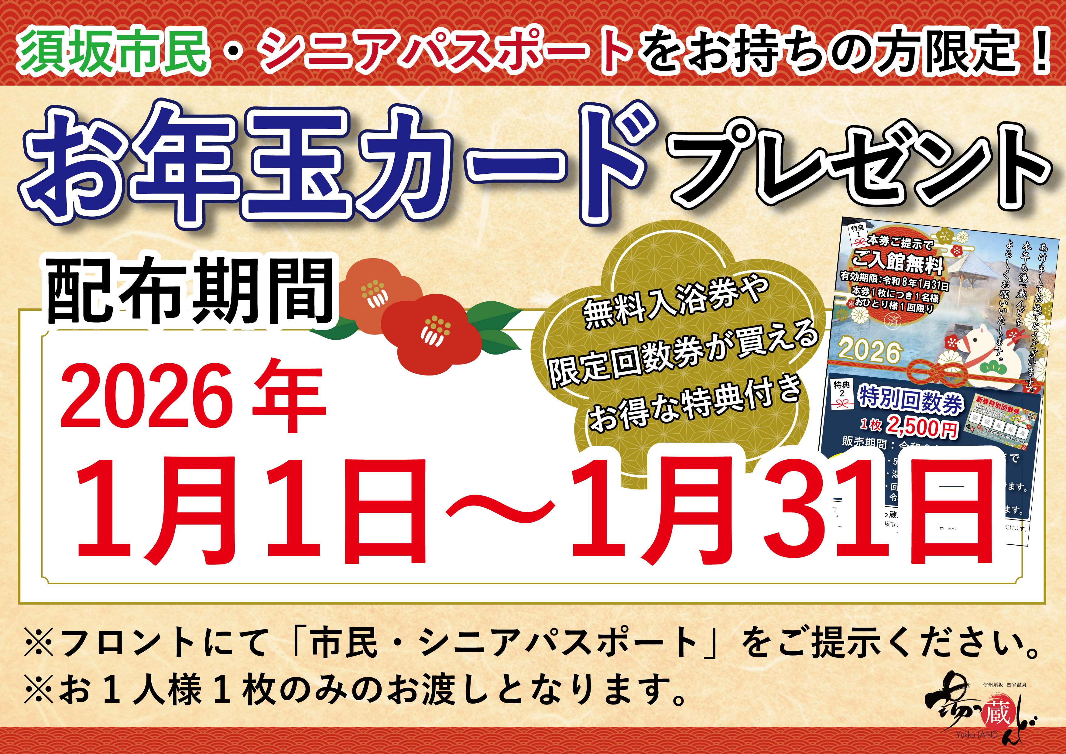 2026年1月1日~1月31日までの期間、フロントにて市民パスポート・市民シニアパスポートをご提示いただきますと入浴無料などの特典付きお年玉カードをプレゼントいたします。