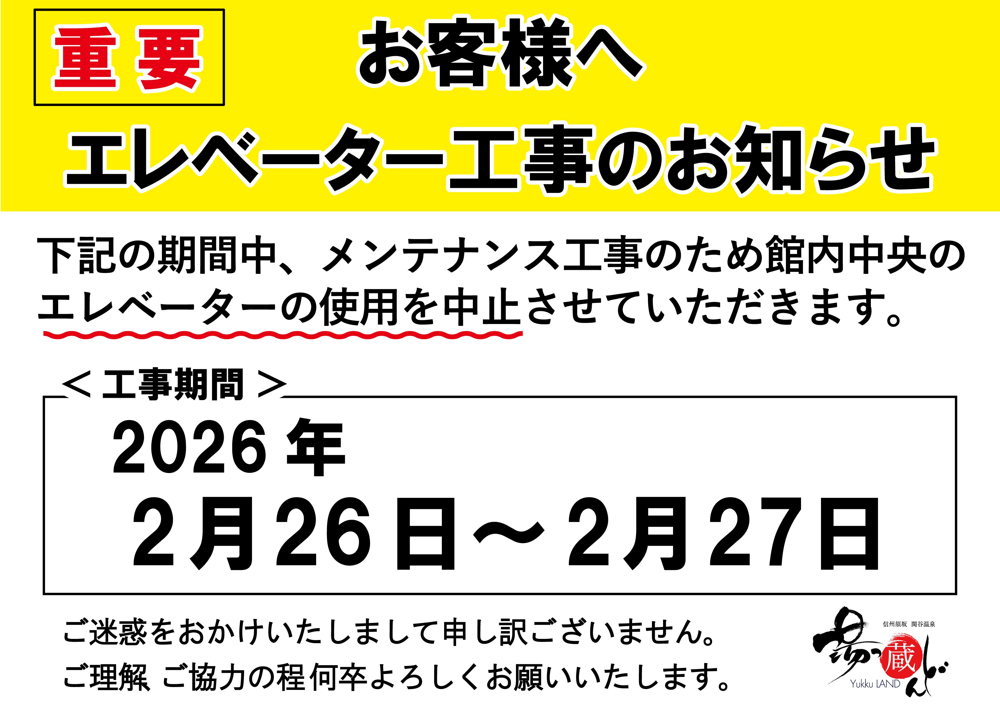 2月26日(木)~2月27日(金)まで、メンテナンス工事のため 館内中央のエレベーターを使用中止とさせていただきます。