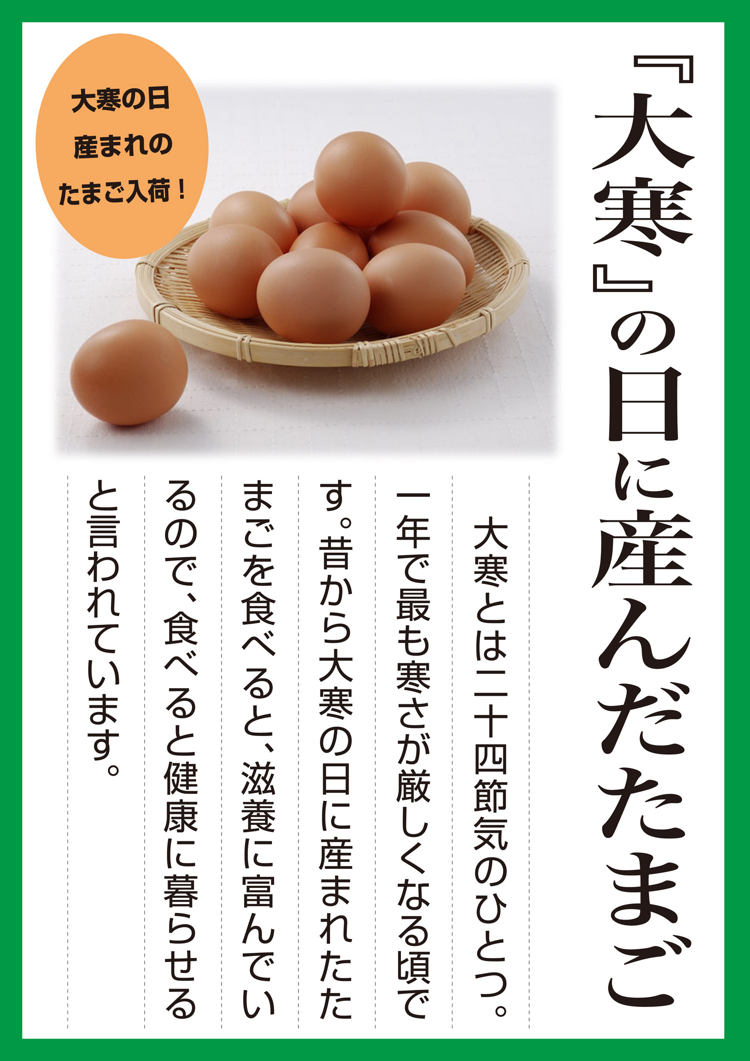 昨年好評だった『大寒』の日に産まれたたまご10個入りを本日、200パック限定で販売いたします。